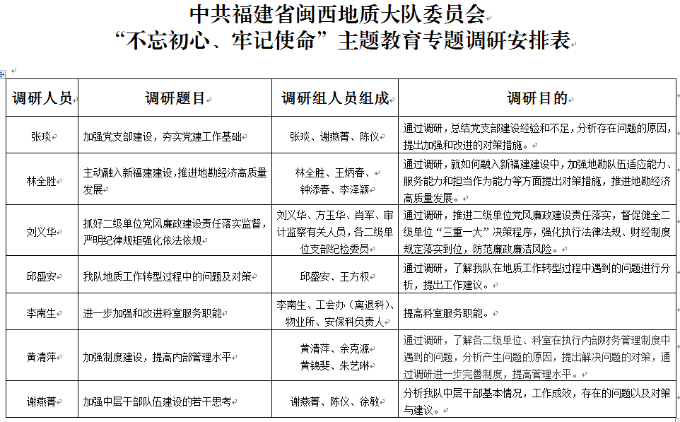 根据前期查找出的突出问题、短板问题和职工群众反映的问题,7位党委委员结合自己分管的工作确定调研课题,在主题教育期间深入开展专题调研,提交一份高质量的调研报告。具体调研安排详见附件。
