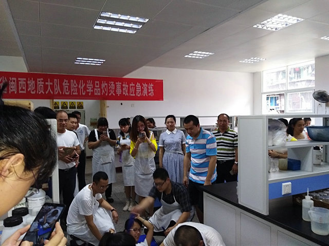 6月21日在队属三明实验室举办了一场危险化学品灼烫事故应急演练。模拟一名职工配制试剂时不慎将硝酸试剂瓶掉落地板,试剂瓶摔碎,引起硝酸溅起灼伤双脚,演练应急处置方案。包括对伤者进行现场清洗包扎并紧急送医,对泄露的硝酸进行清理。结合演练宣讲危险化学品安全知识、应急自救知识。李南生副队长在演练总结中向职工宣讲了“1>9、10-1=0”的安全理念,强调指出,演练旨在增强职工的自我保护意识,掌握事故中自救、互救的基本技能,提醒广大职工在工作中要及时发现问题和消除隐患,警钟长鸣,实现队长治久安。
